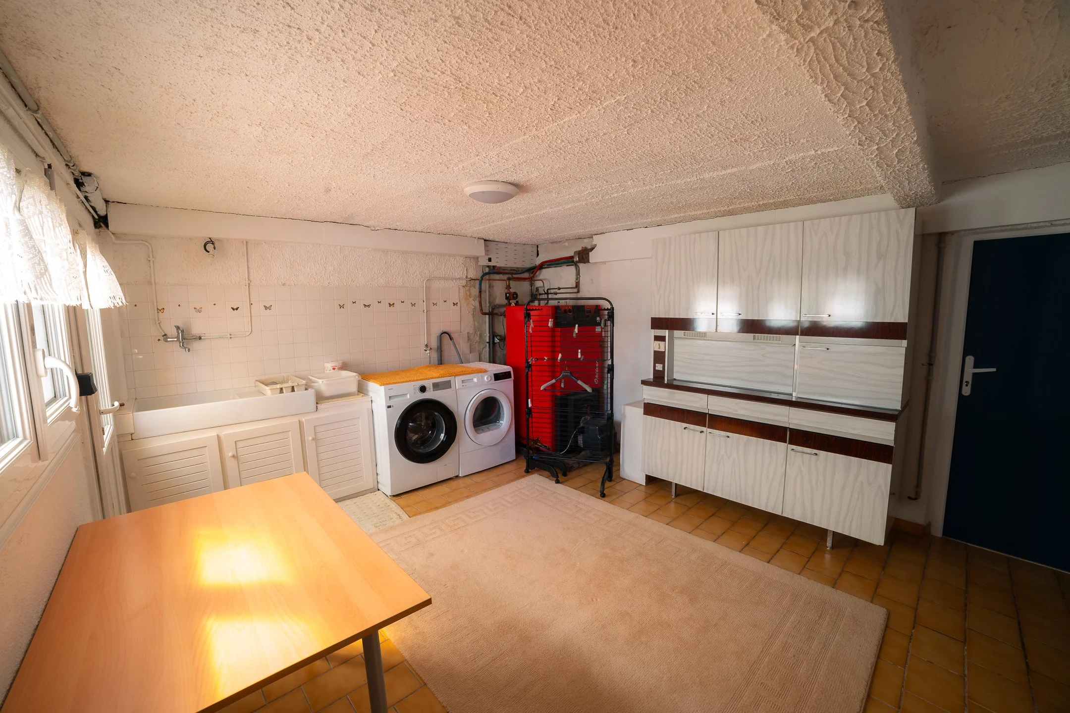 Au sous-sol, la buanderie est équipée d’une machine à laver, d’un sèche-linge et d’un tancarville ( sèche serviette, comme on dit en Bretagne). Un accès direct à l’extérieur, un grand fil à linge vous permet de faire sécher facilement vos affaires au soleil ou à l’air marin.